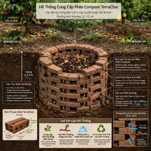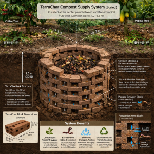 Hệ thống TerraChar Compost Supply System (dạng chôn ngầm) là một giải pháp nông nghiệp bền vững, sử dụng các khối gạch TerraChar (biochar kết hợp đất sét) để tạo thành một cấu trúc lưu trữ và phân phối dinh dưỡng ngay trong lòng đất.